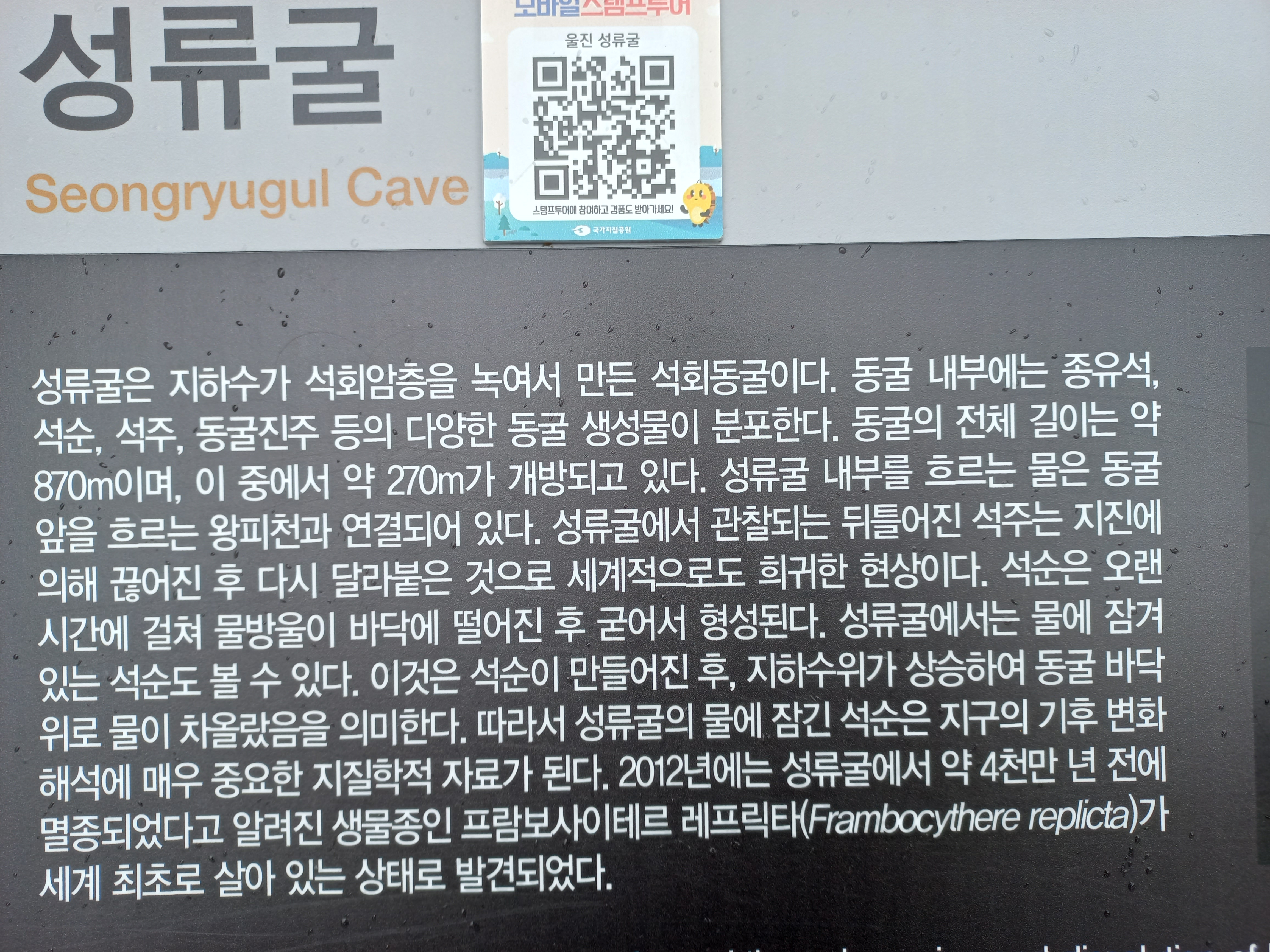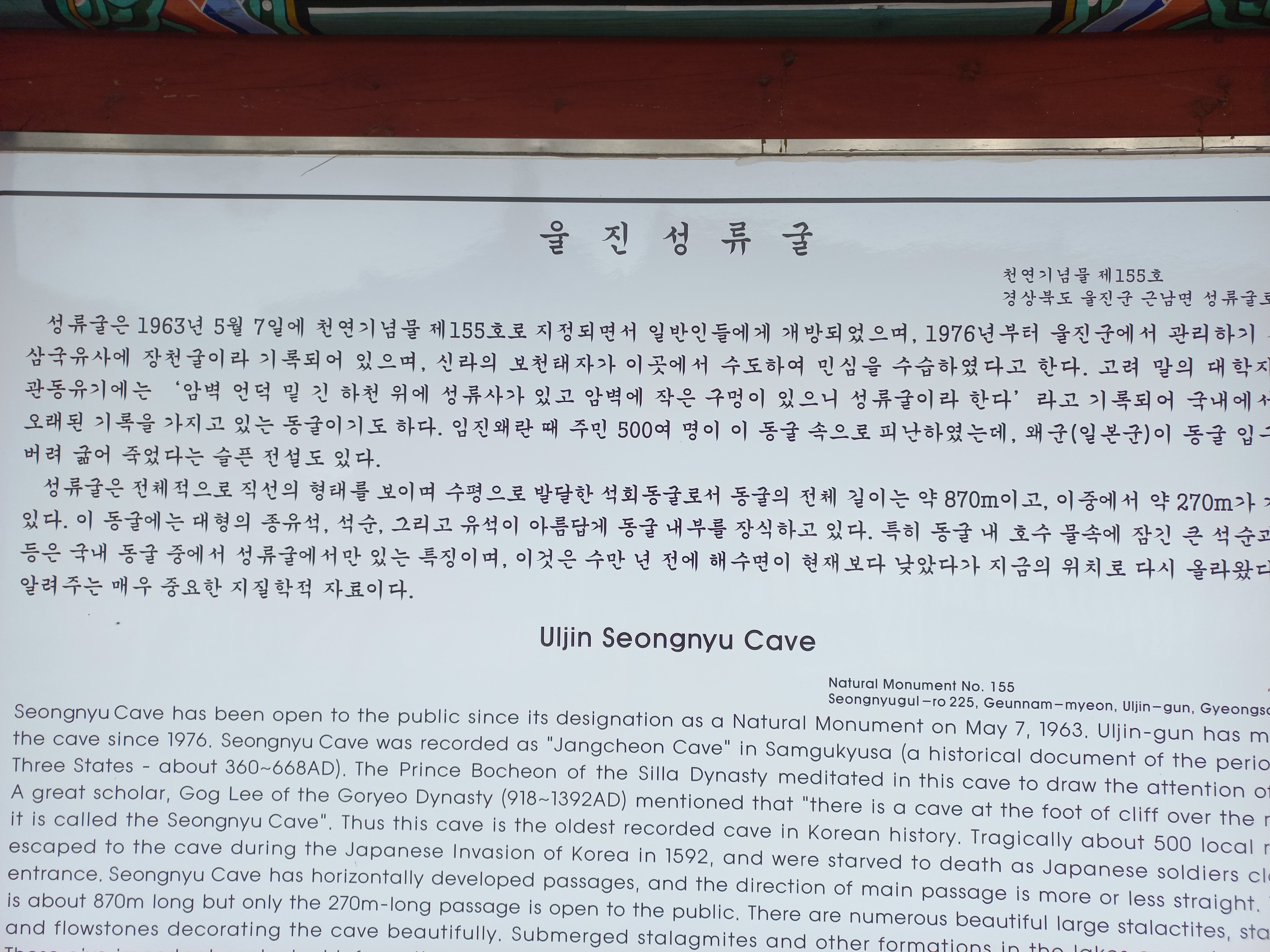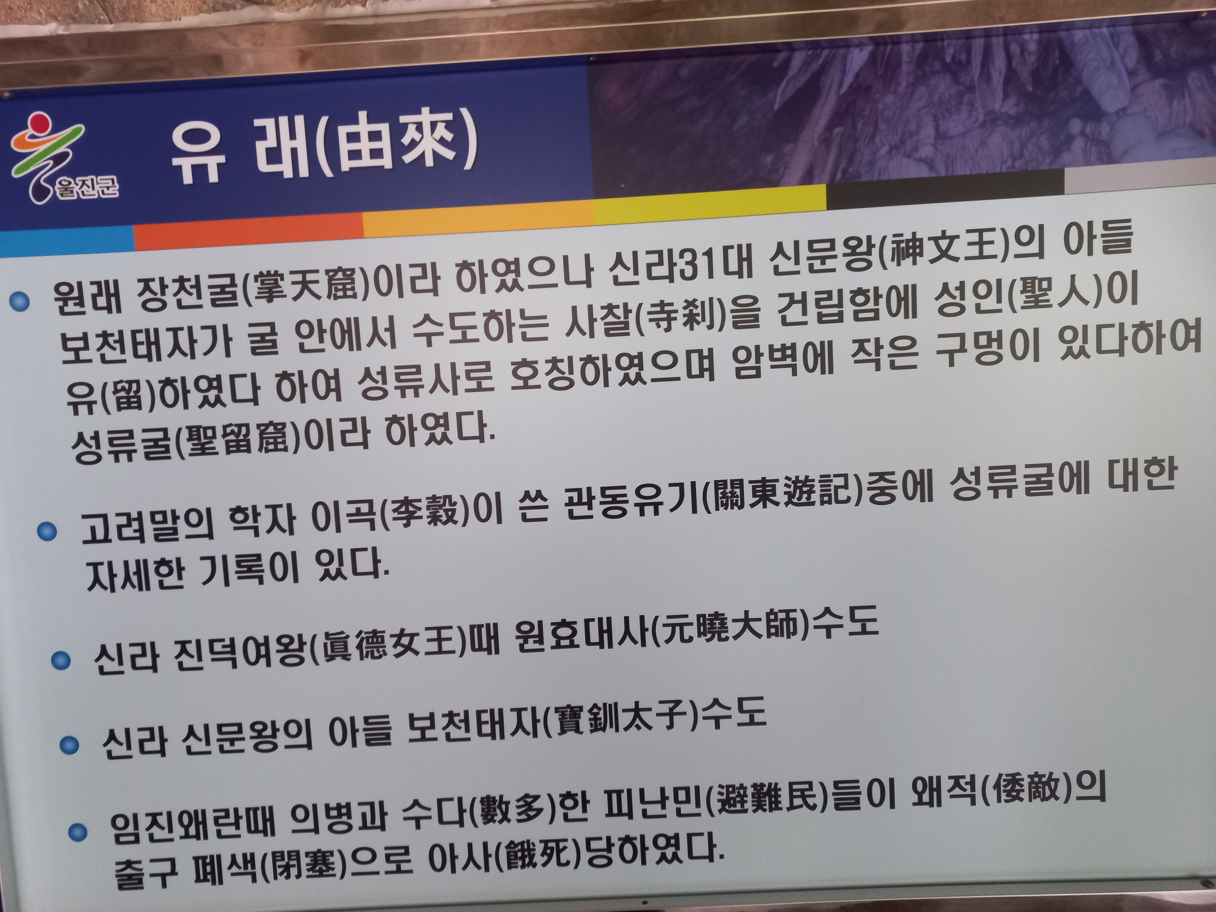 2022. 10. 24. 월요일 대전을 출발할때는 맑은 날씨 였으나 영덕고속도로를 나와 울진을 향하면서 바람불고 빗방울을 보이더니 성류굴에 도착할때는 비가 내리기 시작했음. 성류굴 입구에 들어서니 휴관이라는 팻말이 길을 막아 서있어 성류굴 입구만 둘러 보고 나왔음