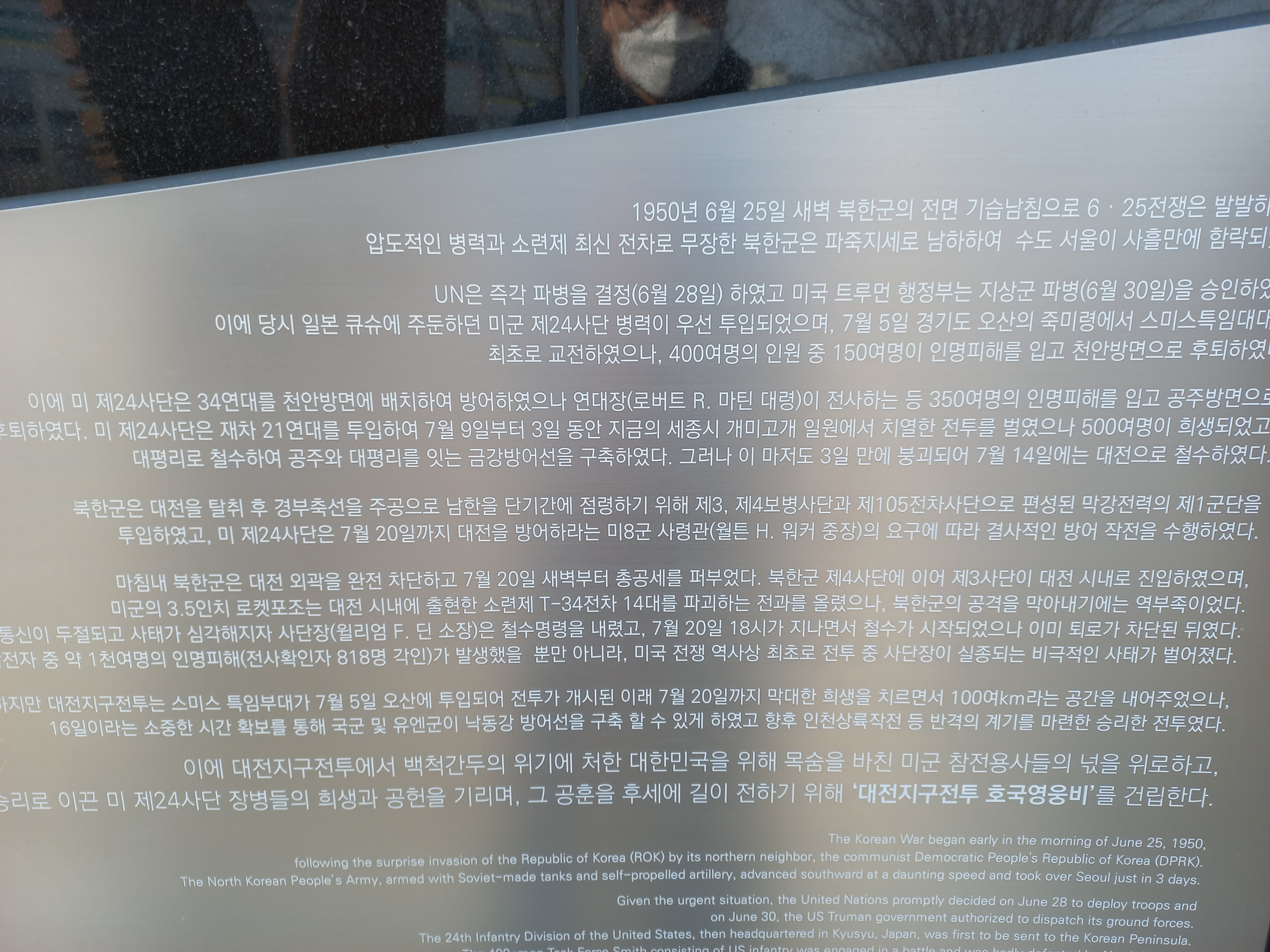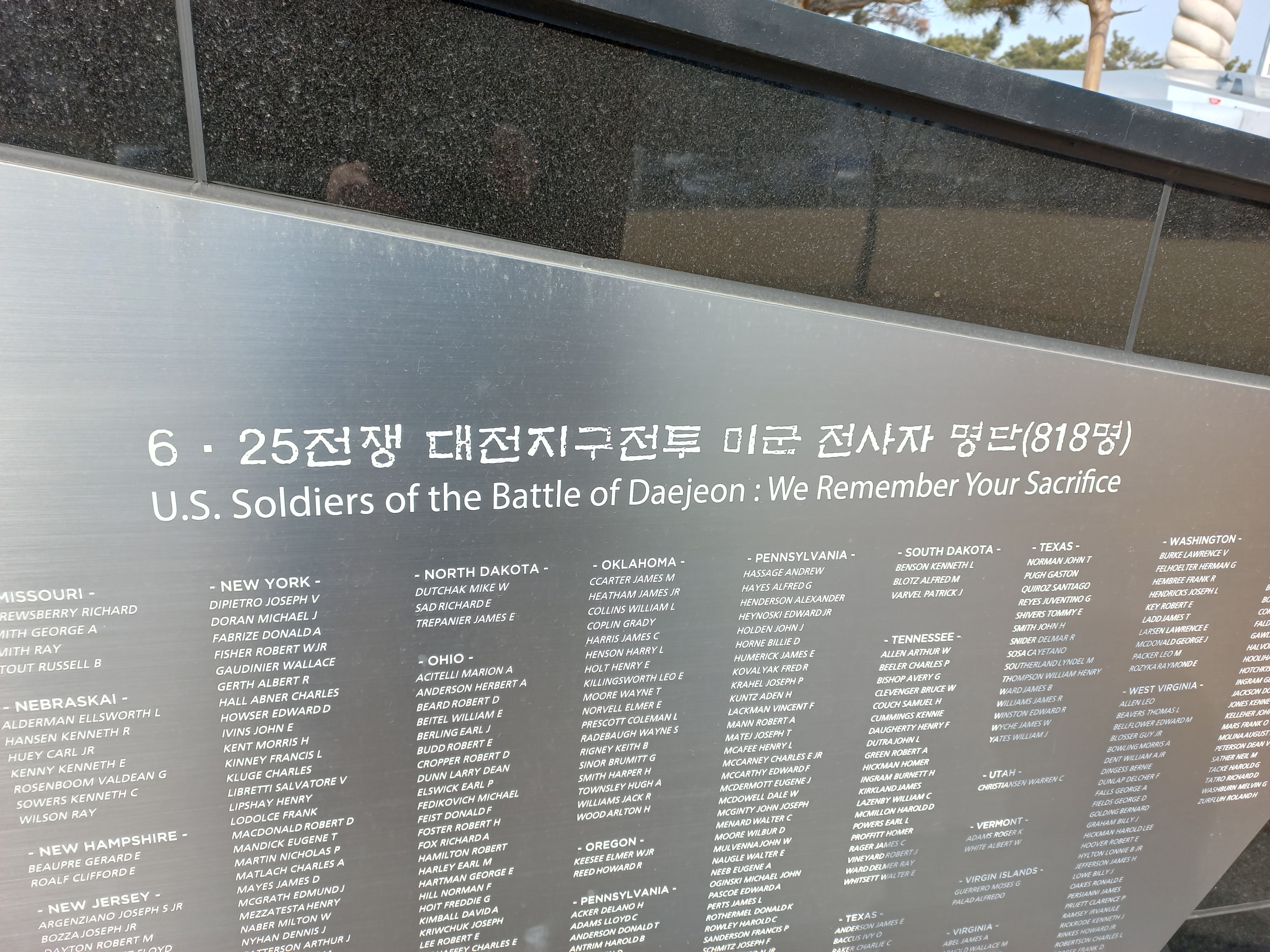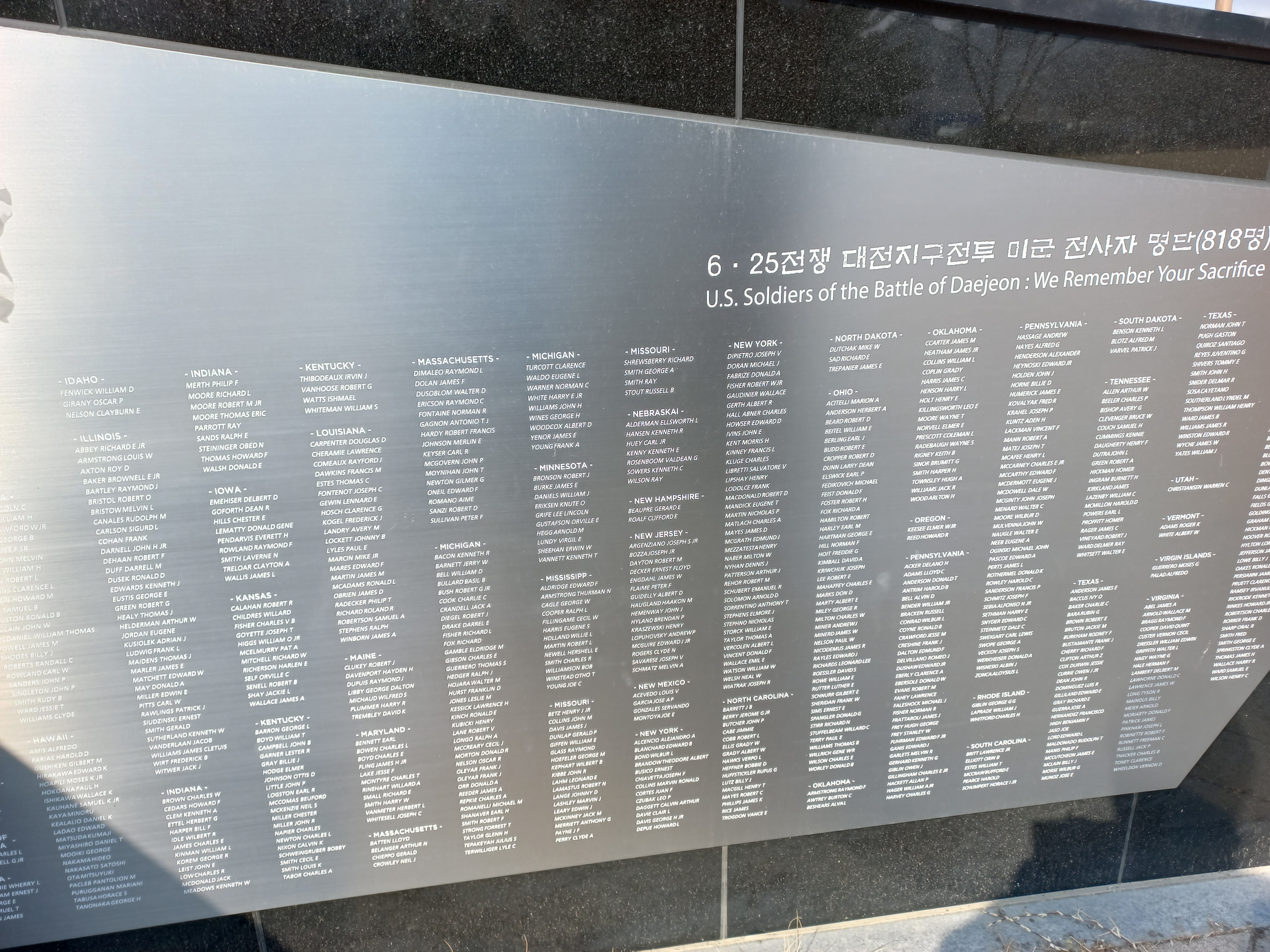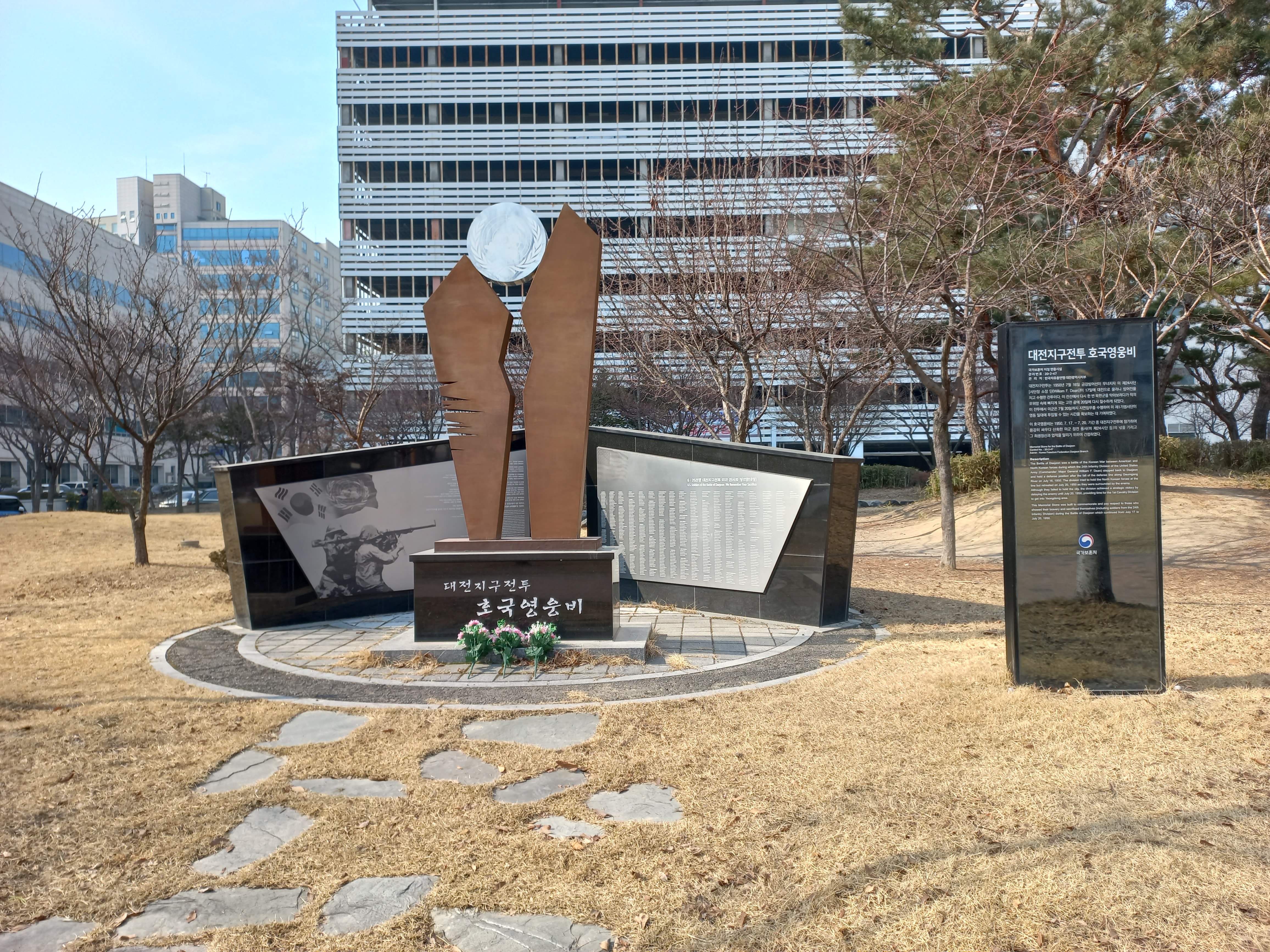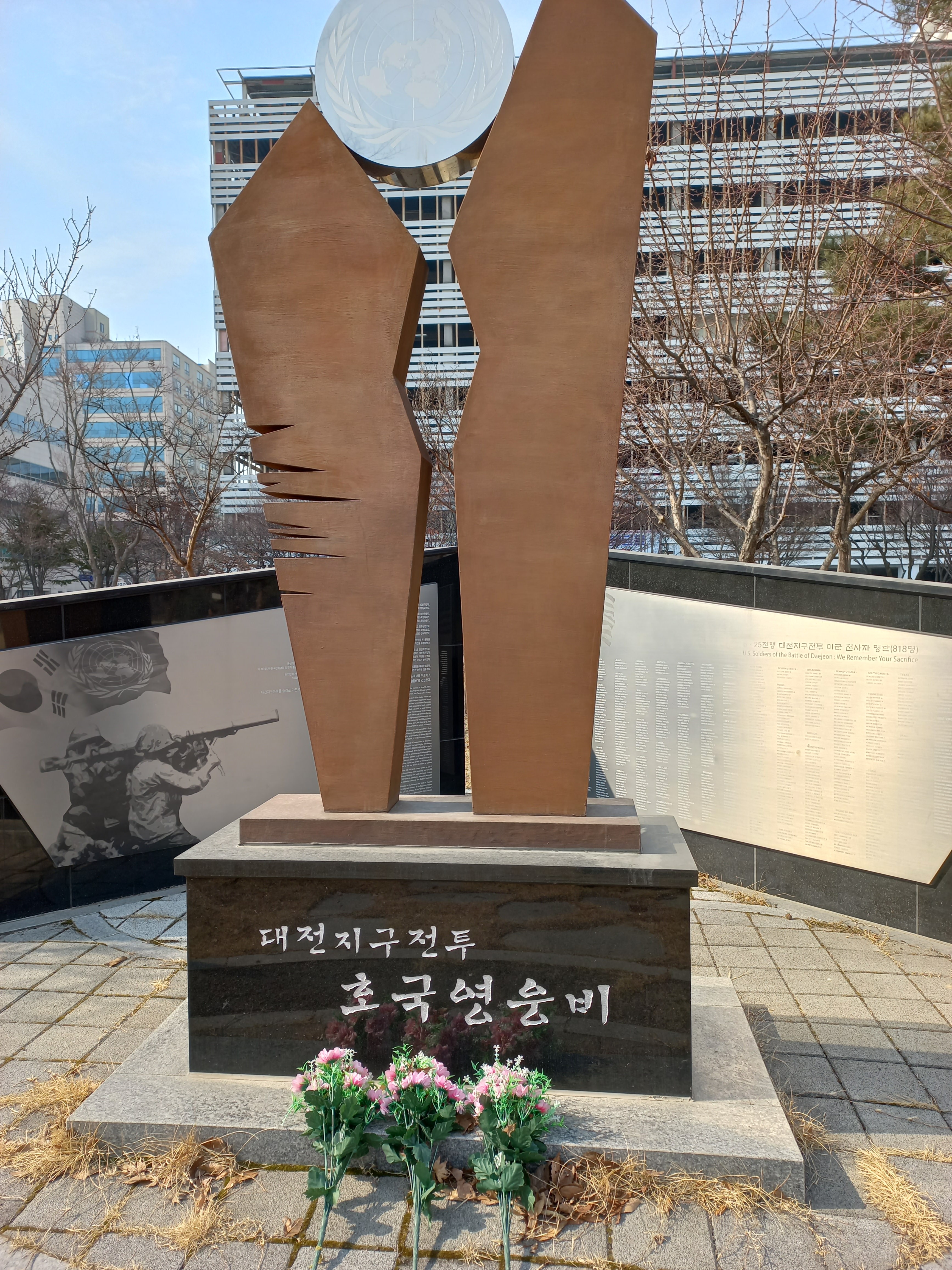 그룹명/• 여행 미군 대전지구 전투 호국 영웅비 *코쓰모쓰* 2023. 3. 4. 07:22 6.25. 한국 전쟁중 대전지구 전투에서 사망한 미군 818명을 기리는 호국 영웅비가 구 공군기교단내, 현 대전 시창앞 보라매 광장에 건립되어 있음 (2023. 2. 7. 촬영) 공유하기 URL 복사카카오톡 공유페이스북 공유엑스 공유 게시글 관리 구독하기나만의 특별한 이야기♡ '그룹명 > • 여행' 카테고리의 다른 글 이가리 닻 전망대 (0) 2023.03.10 일출 (0) 2023.03.04 해넘이 (0) 2022.10.31 도산서원 (0) 2022.10.26 고래불 해수욕장 (0) 2022.10.26 '그룹명/• 여행' Related Articles 이가리 닻 전망대 일출 해넘이 도산서원